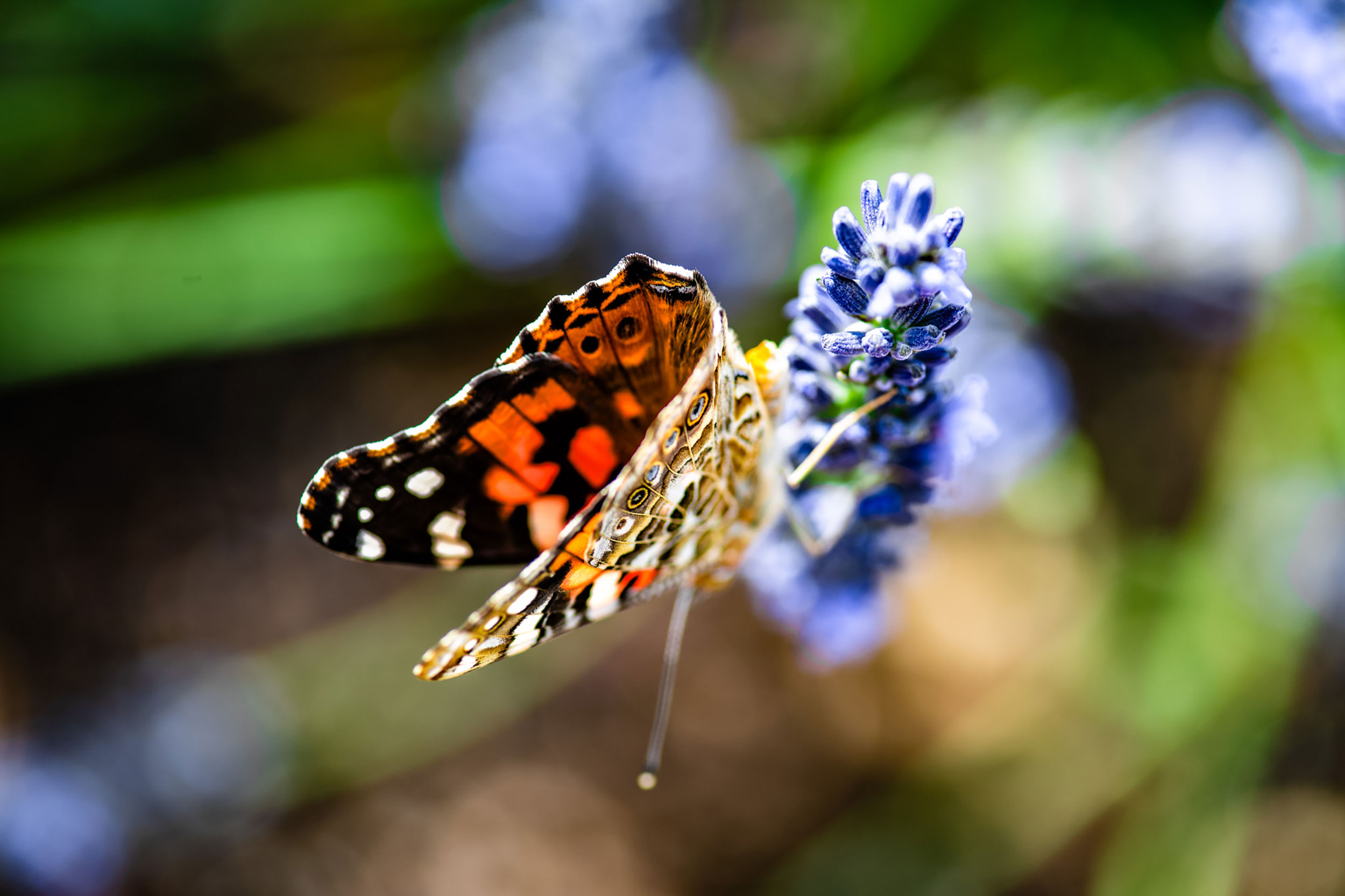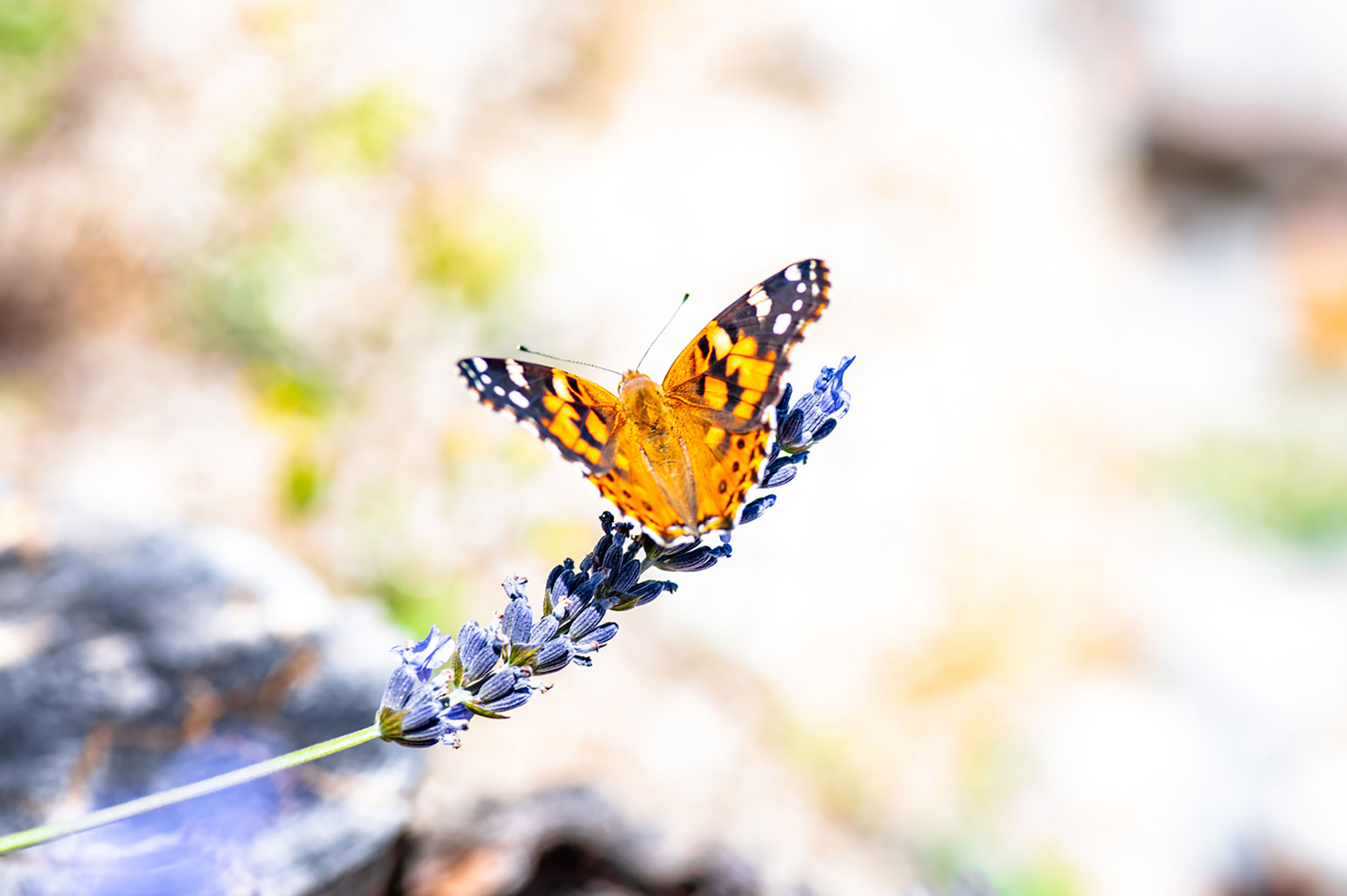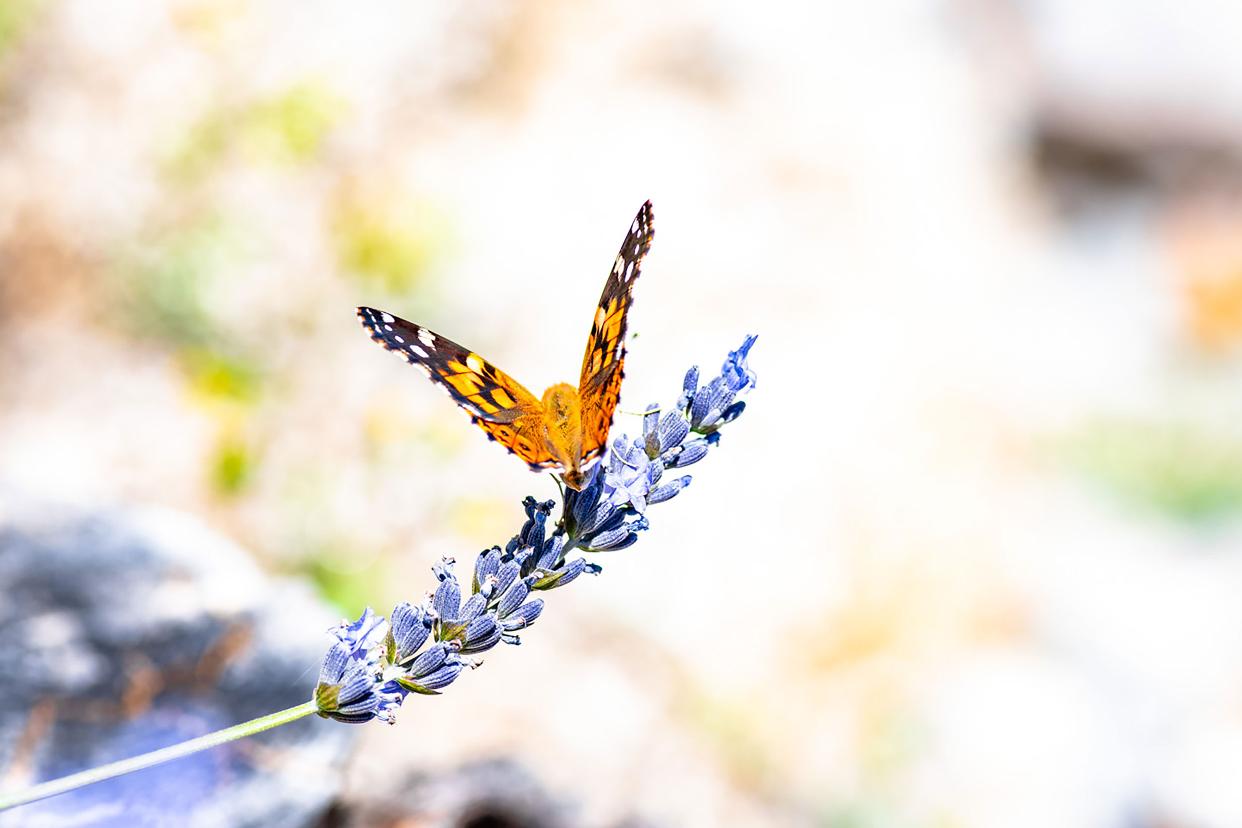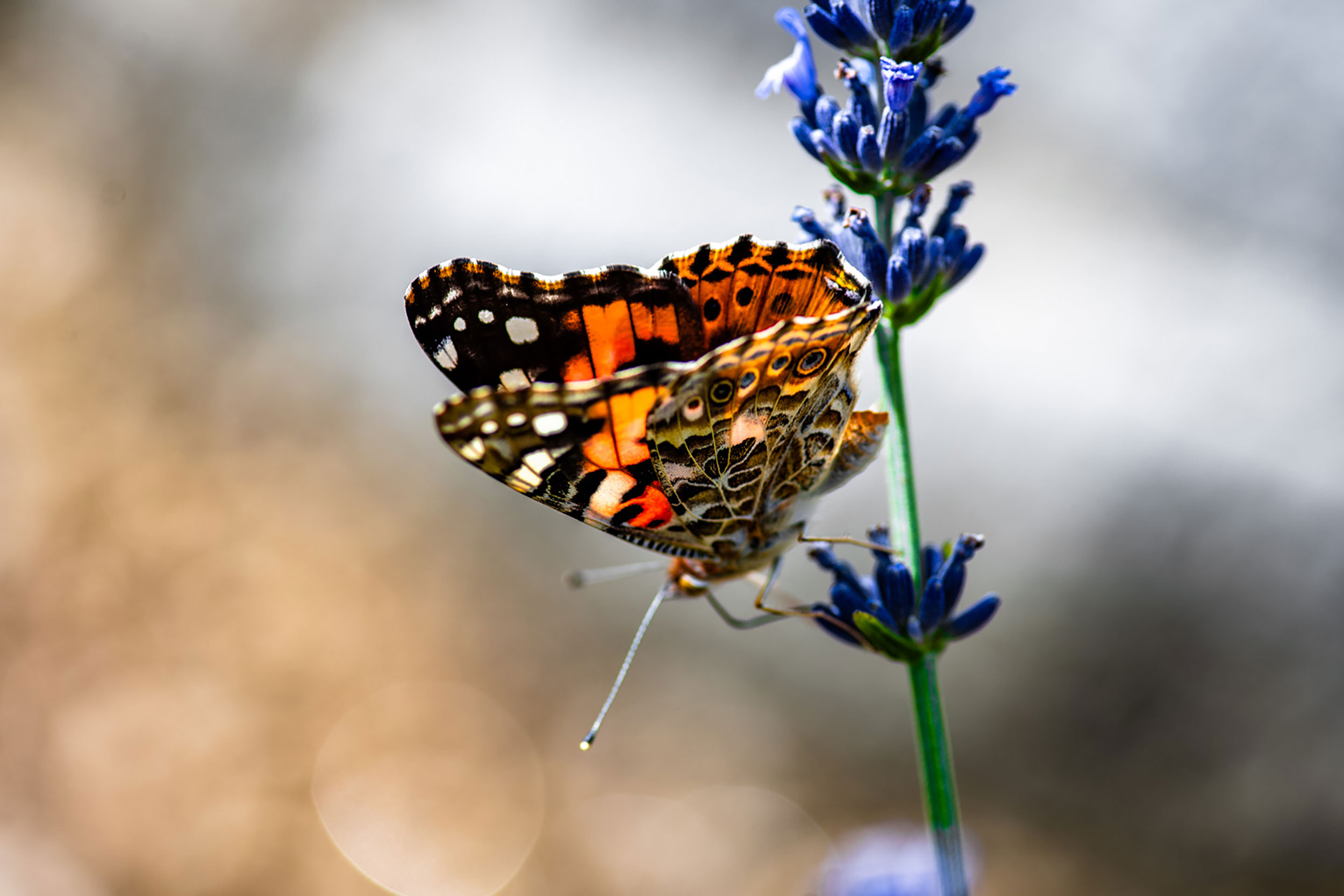 This intimate photo shows a butterfly quietly perched on a lavender stalk, its wings folded like petals in the breeze. Surrounded by gentle hues and the calm of the garden, it’s a moment of stillness that speaks to the fragile beauty of the natural world.