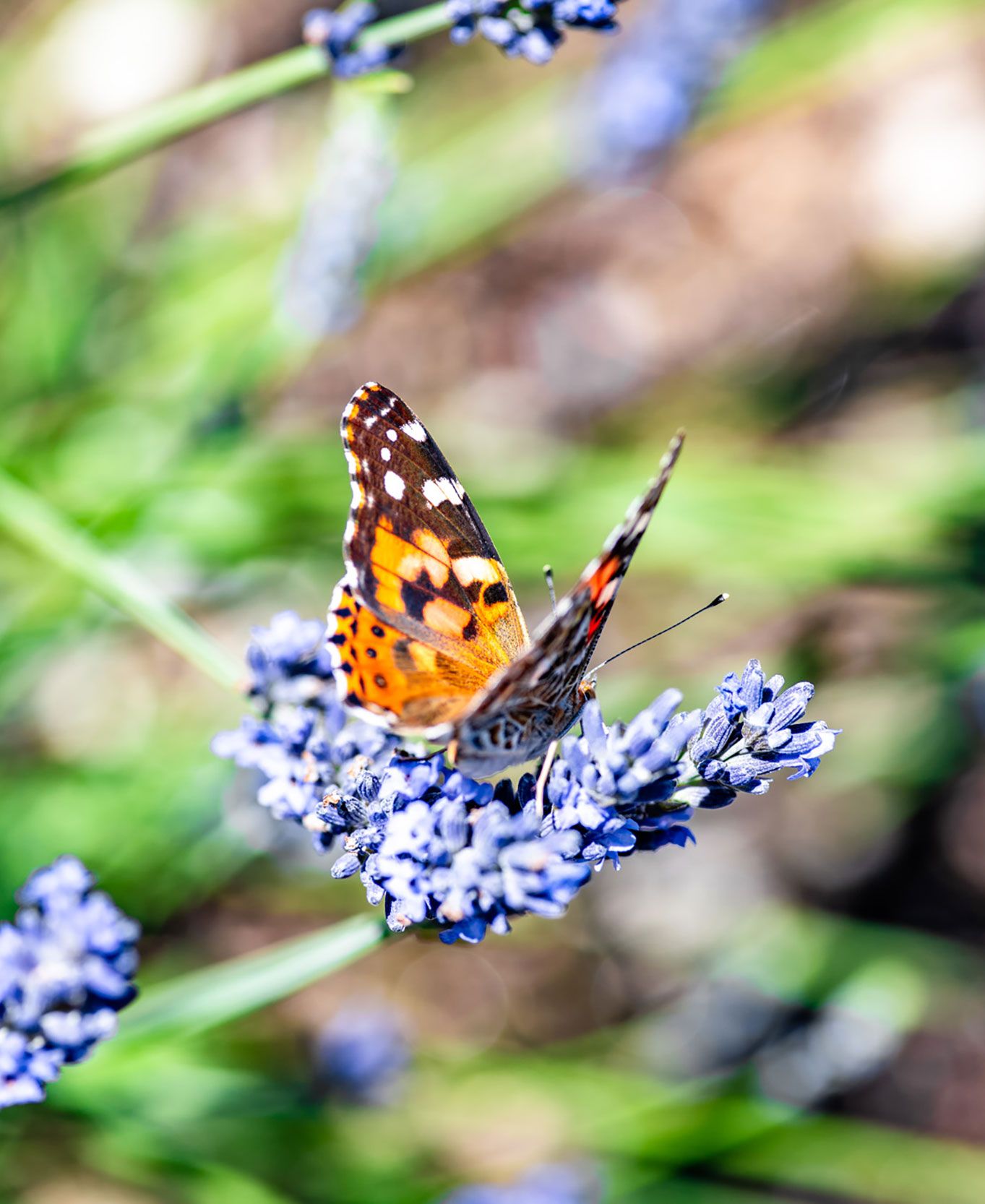 This peaceful image showcases a butterfly delicately perched on a lavender stem, wings folded in perfect stillness. Framed by soft purple blossoms, it’s a quiet, intimate glimpse into the gentle pace of garden life.