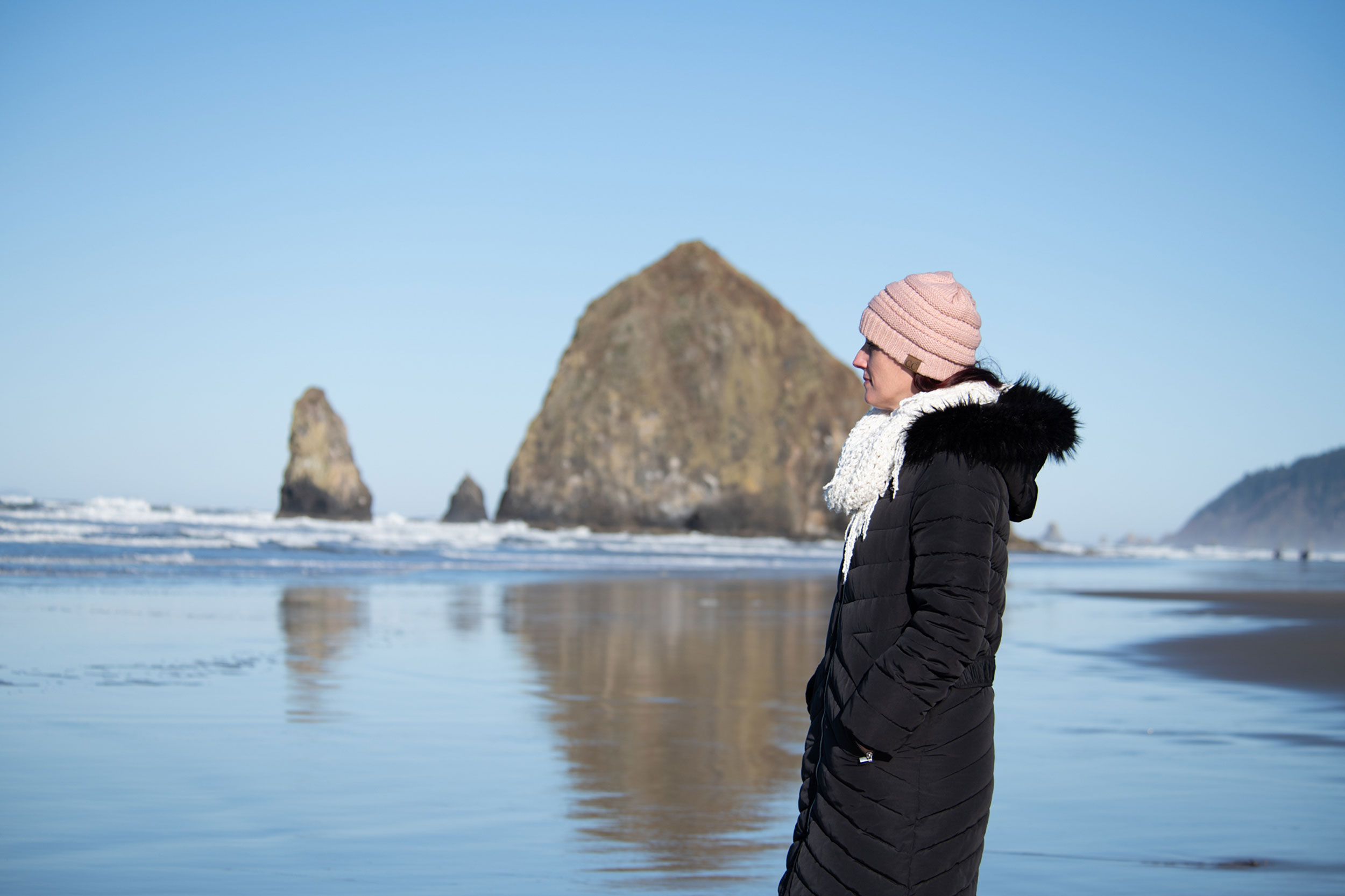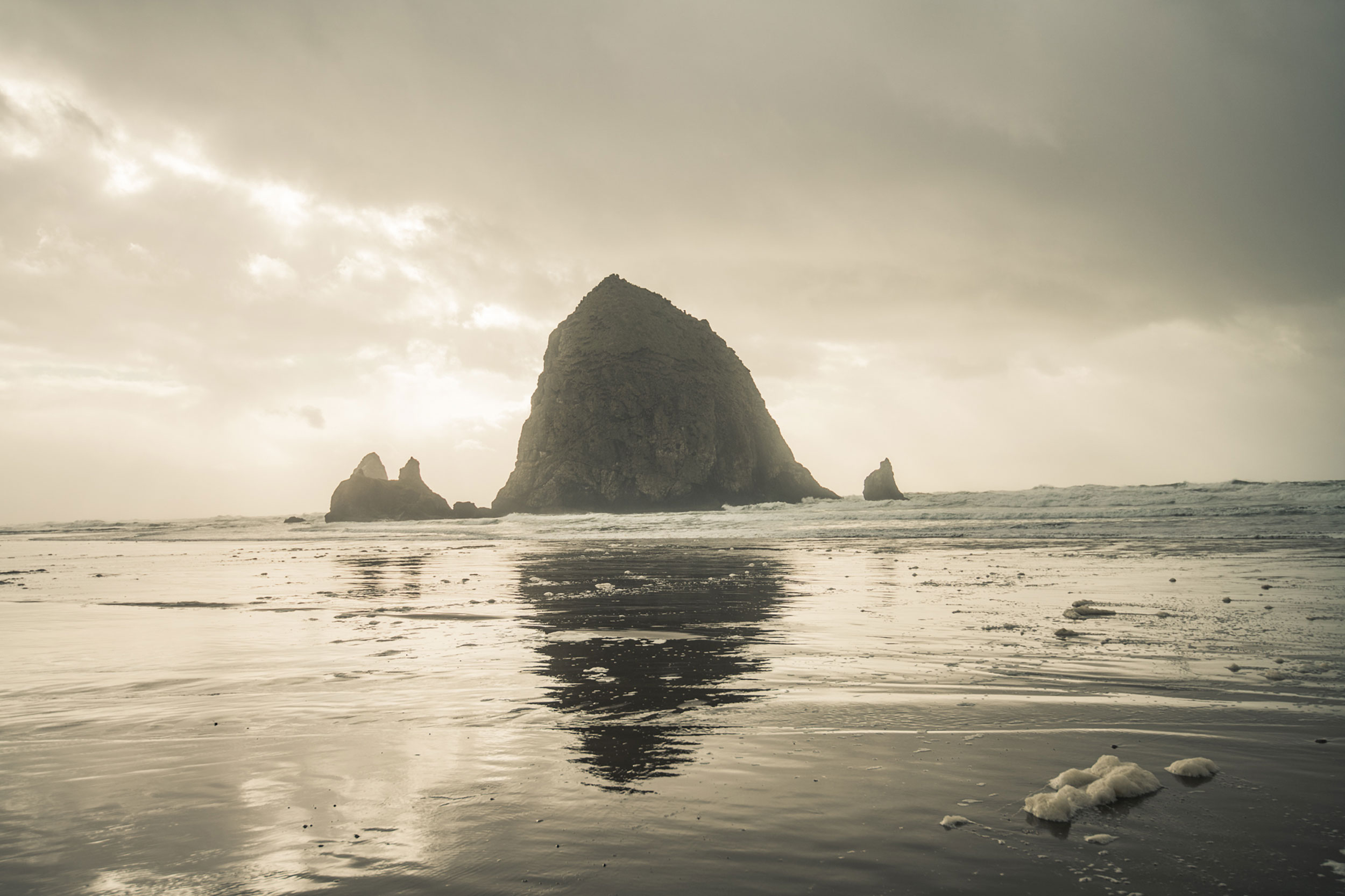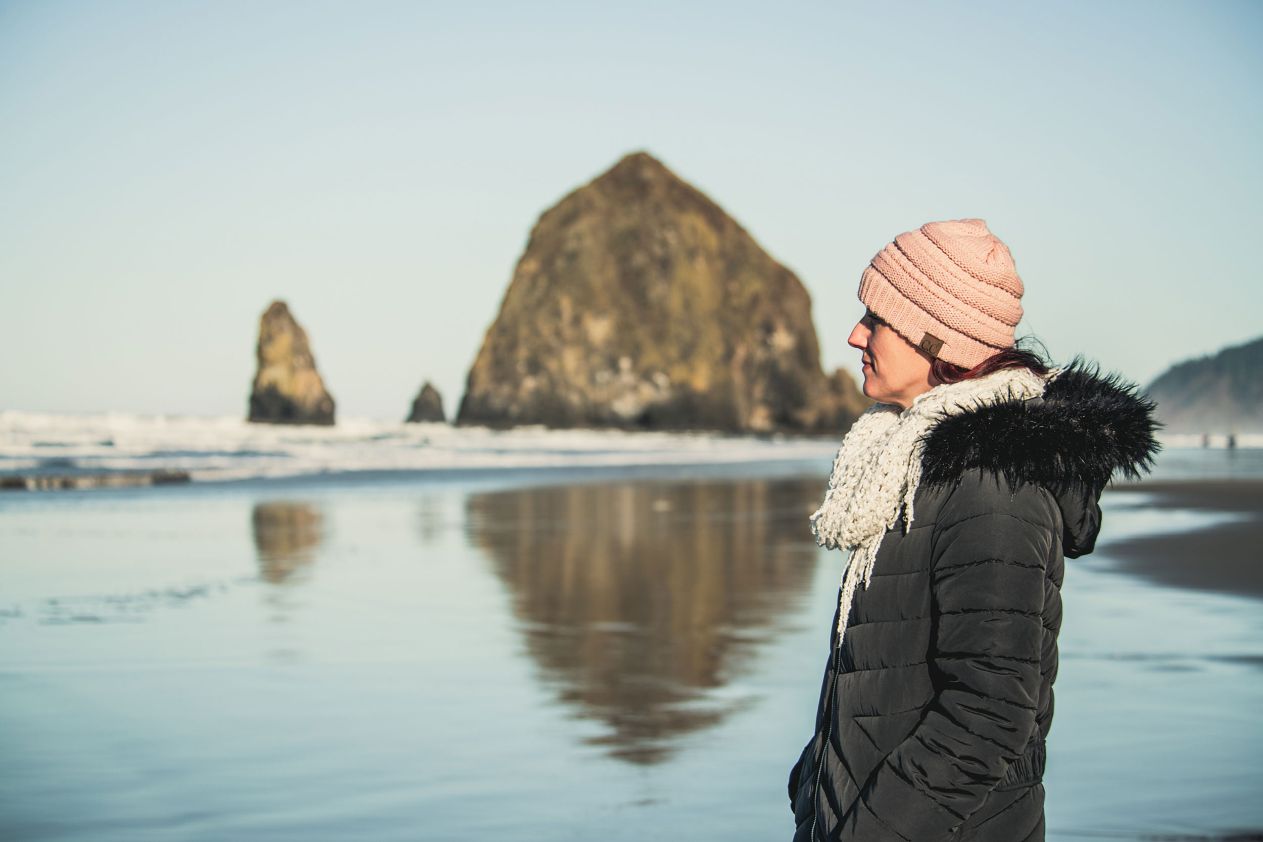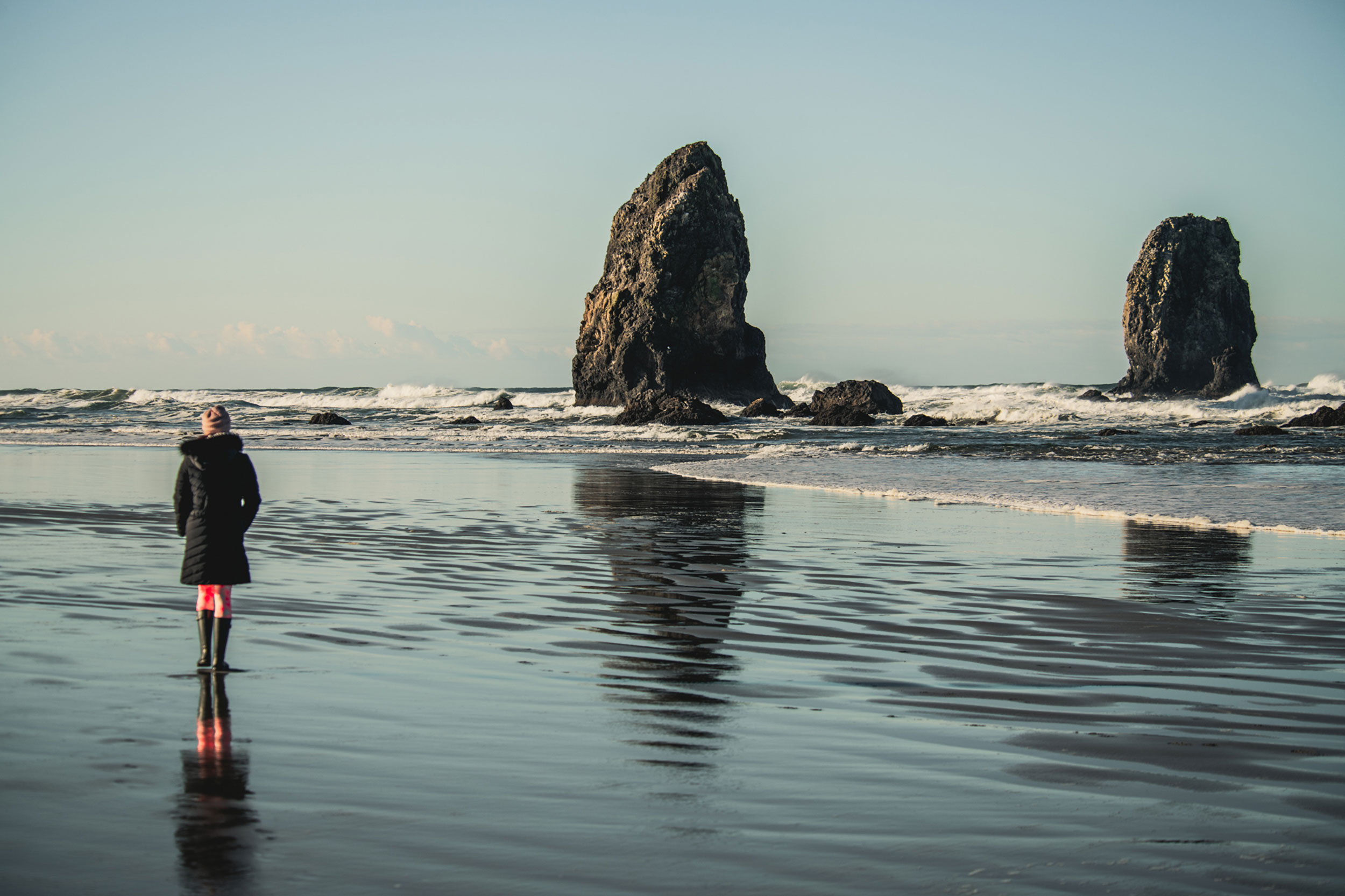 A lone figure stands on the glistening shoreline of Cannon Beach, Oregon, gazing toward the iconic Haystack Rock as storm clouds gather overhead. Reflected in the wet sand, the scene captures the raw beauty and moody atmosphere of the Oregon Coast, where the ocean’s power meets the stillness of quiet contemplation.