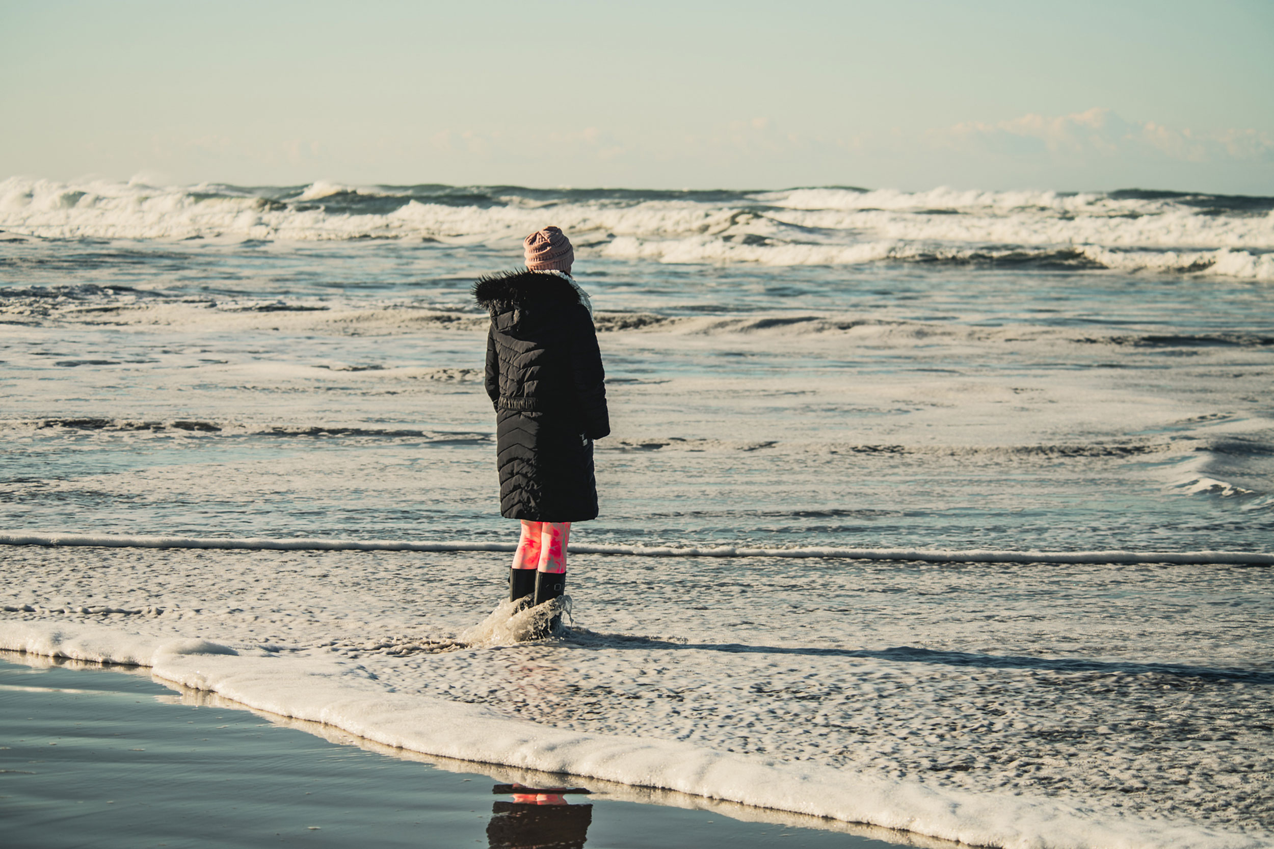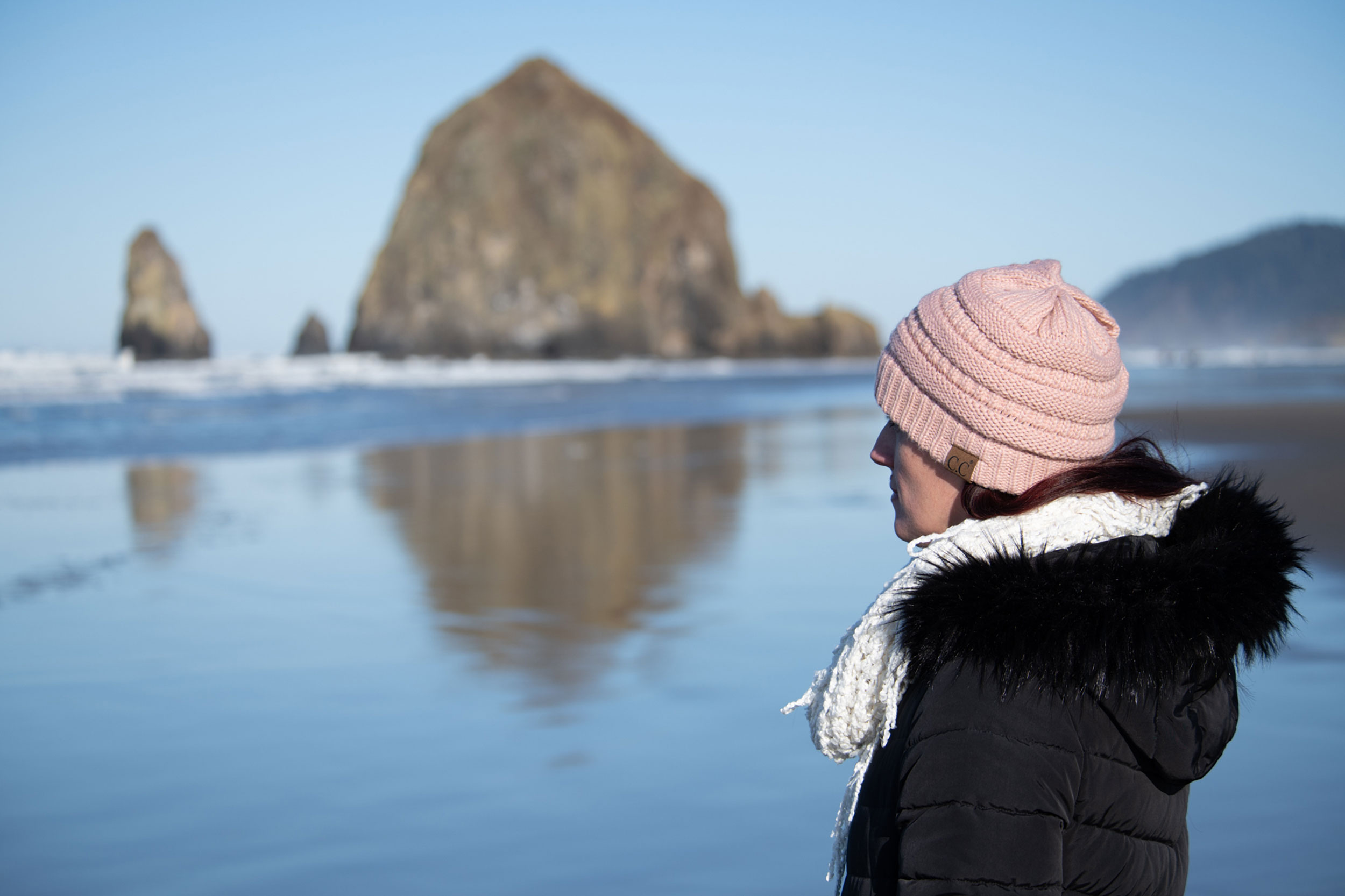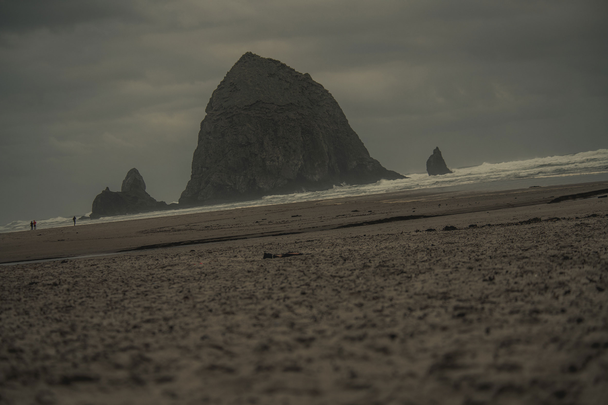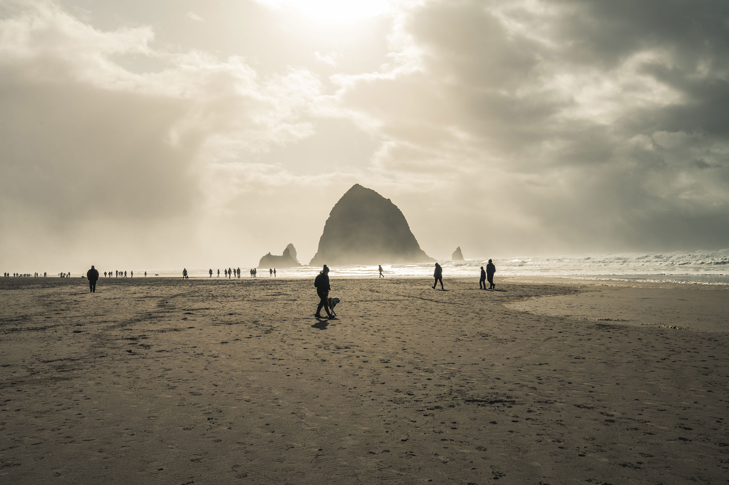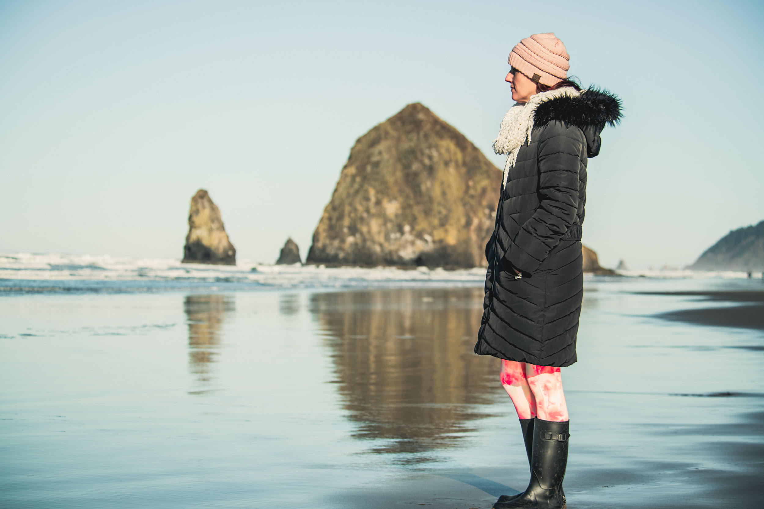 A lone figure stands on the glistening shoreline of Cannon Beach, Oregon, gazing toward the iconic Haystack Rock as storm clouds gather overhead. Reflected in the wet sand, the scene captures the raw beauty and moody atmosphere of the Oregon Coast, where the ocean’s power meets the stillness of quiet contemplation.