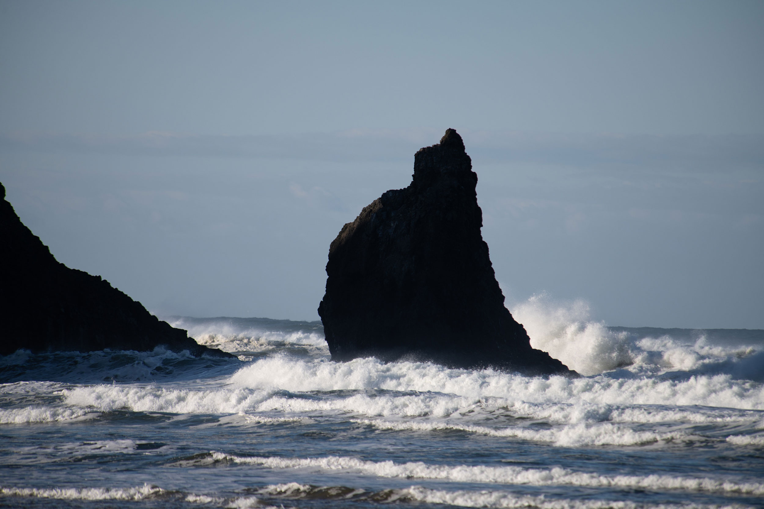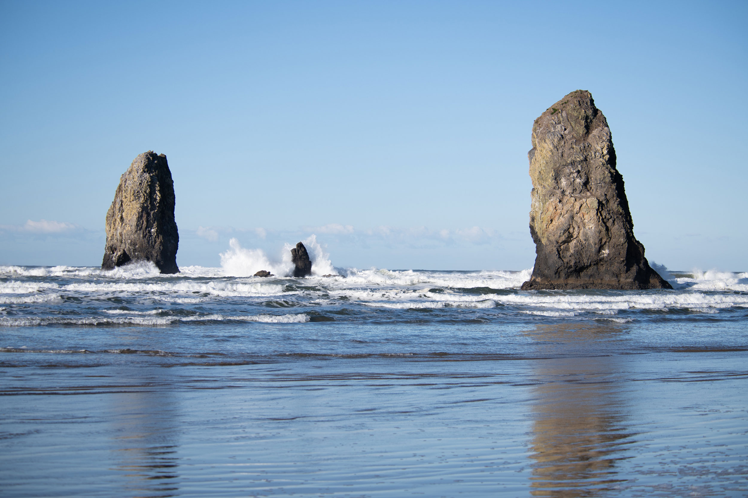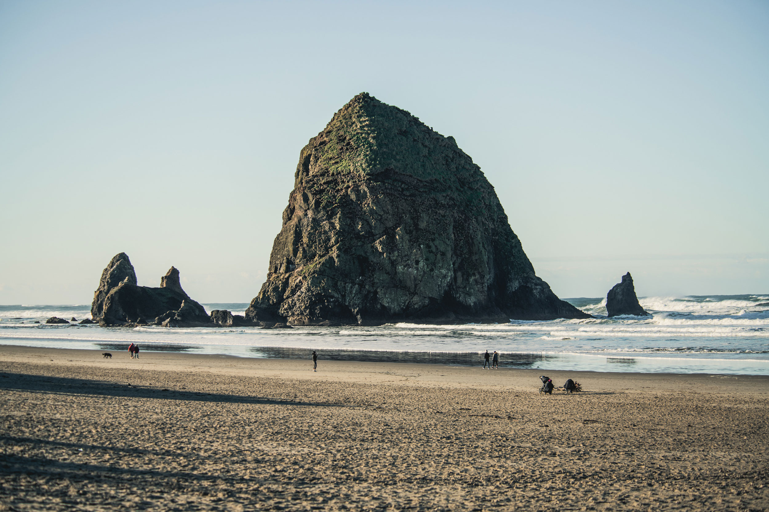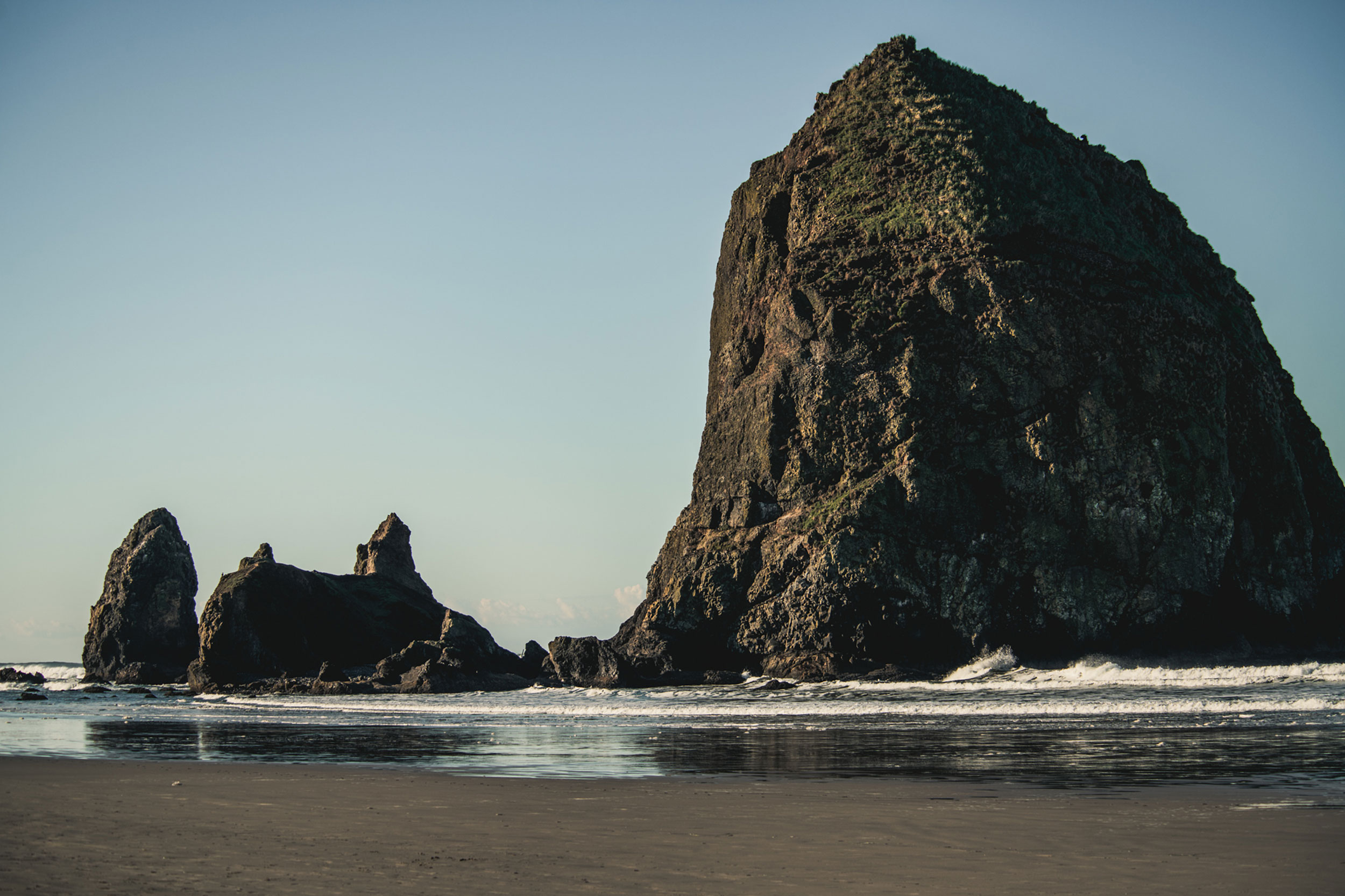A lone figure stands on the glistening shoreline of Cannon Beach, Oregon, gazing toward the iconic Haystack Rock as storm clouds gather overhead. Reflected in the wet sand, the scene captures the raw beauty and moody atmosphere of the Oregon Coast, where the ocean’s power meets the stillness of quiet contemplation.