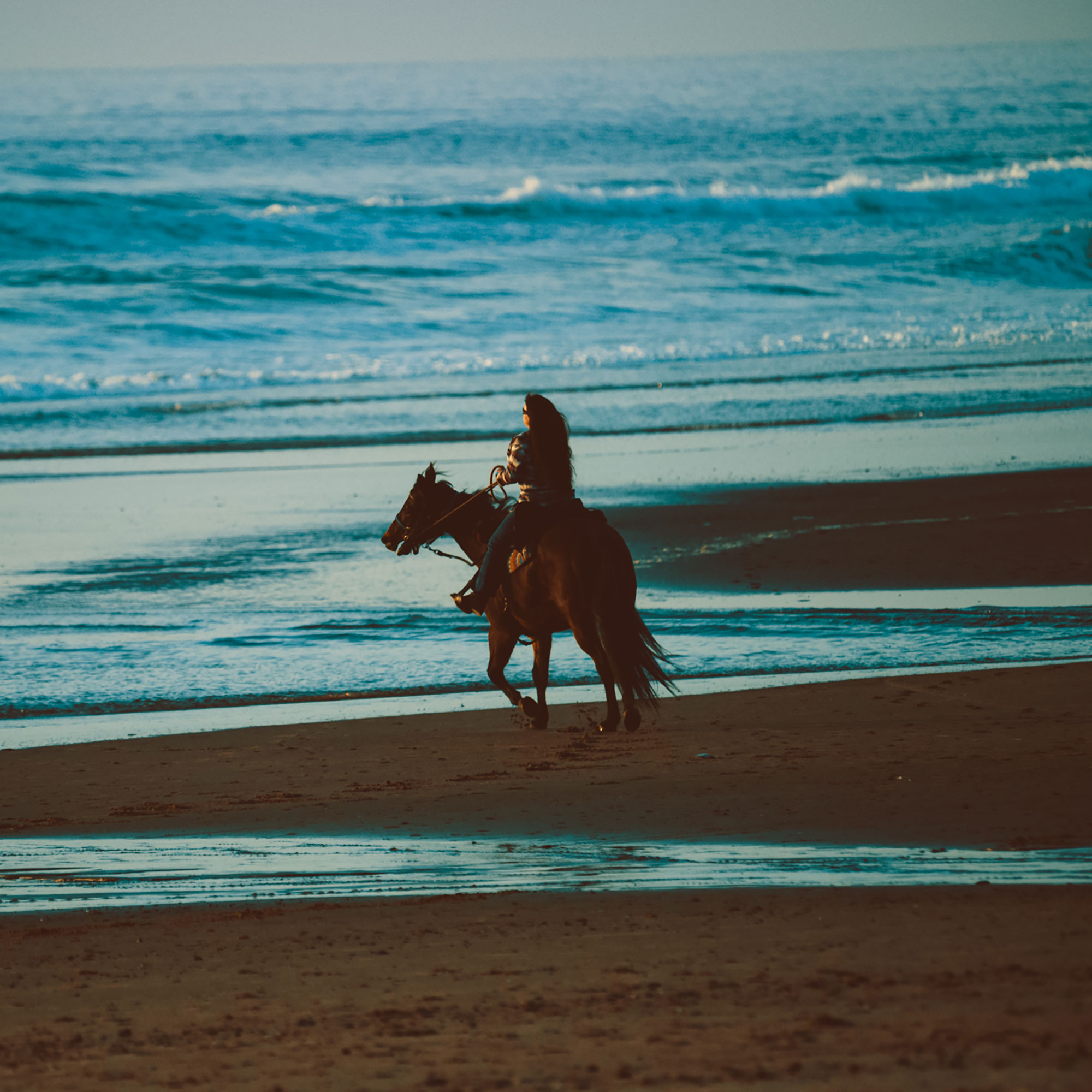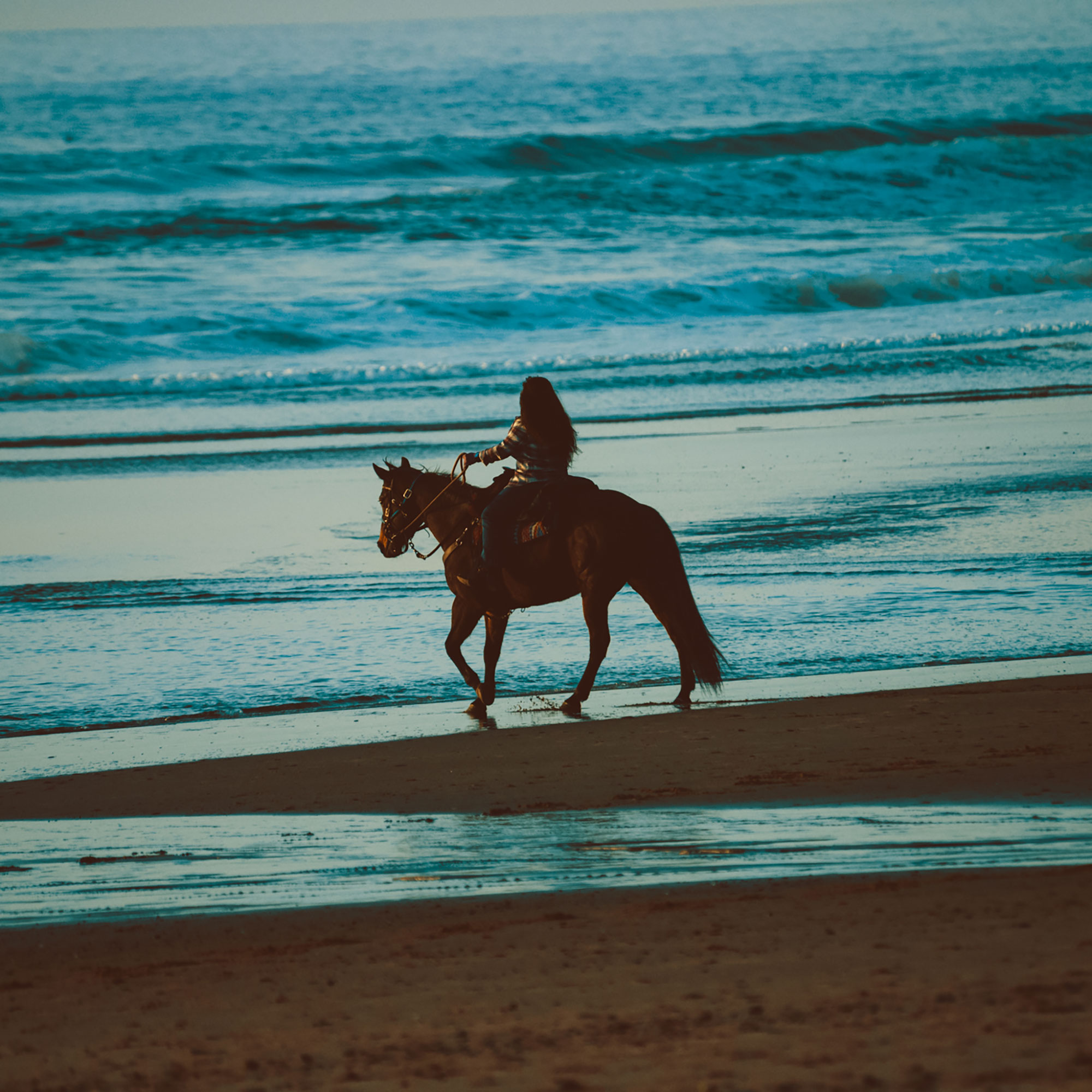 Silhouetted against the setting sun, the woman and her horse move effortlessly through the surf. With each step along the glowing shoreline, the scene captures the quiet magic of connection, rhythm, and coastal serenity.