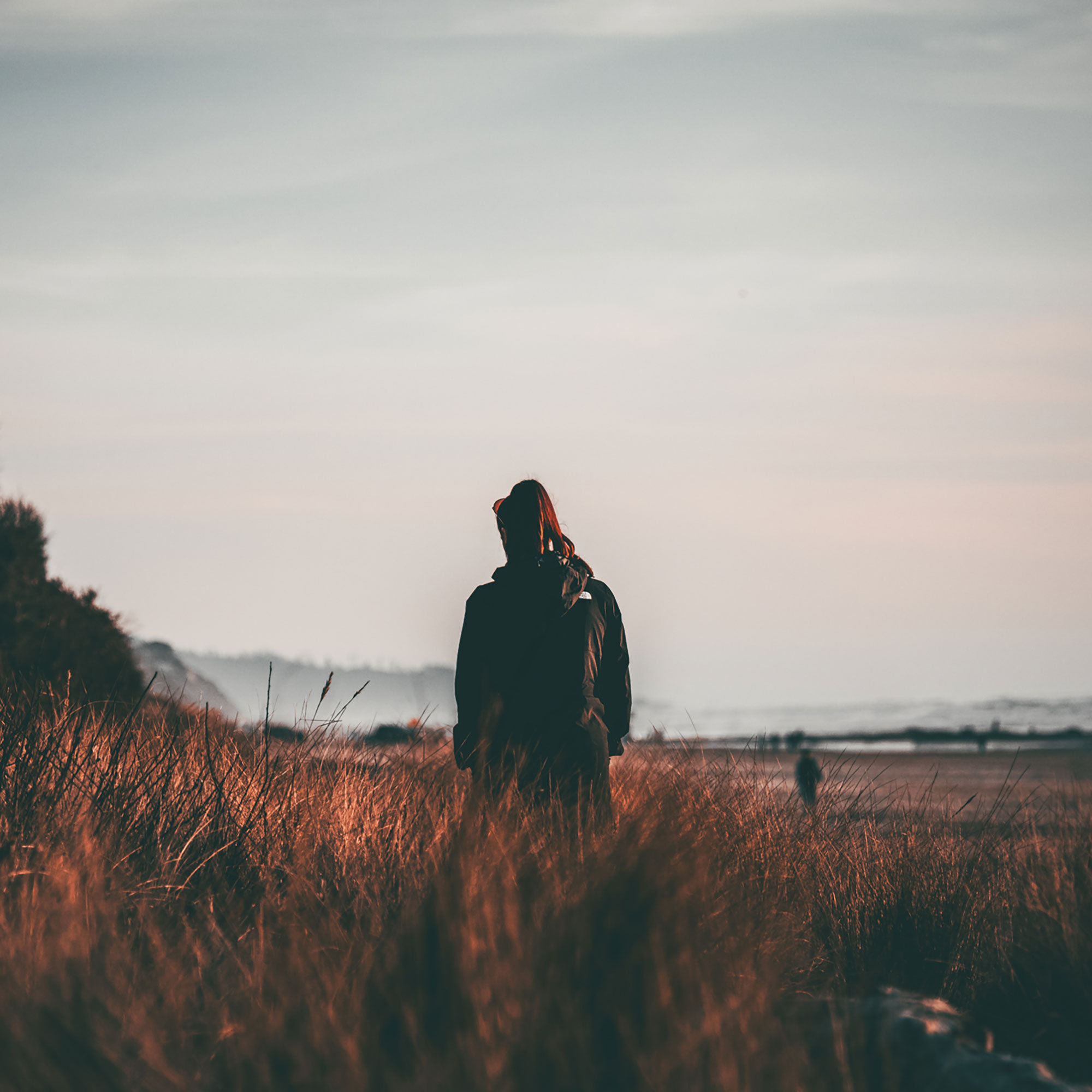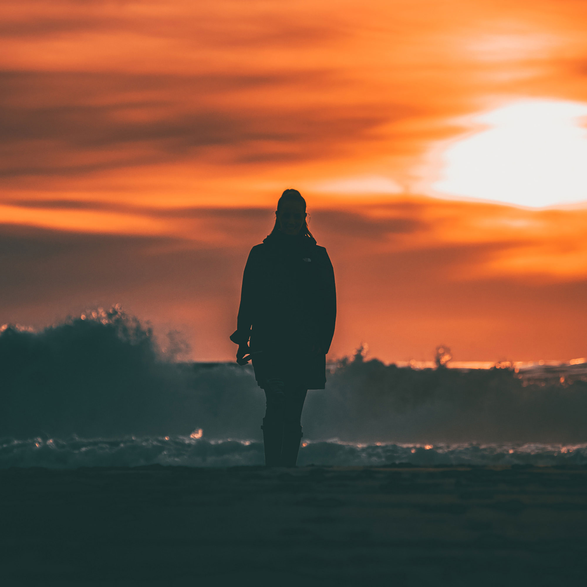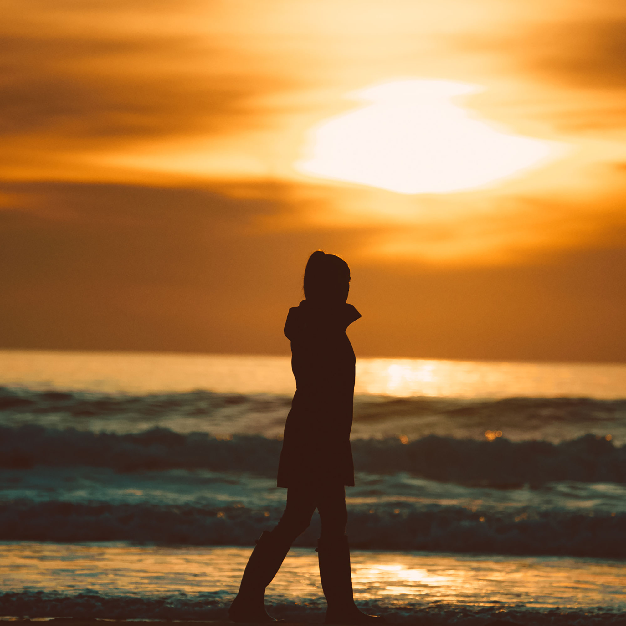 Bathed in the warm light of sunset, Cari strolls along the shoreline as waves crash in the distance. The moment is calm, powerful, and beautifully timeless—nature and presence in perfect harmony.