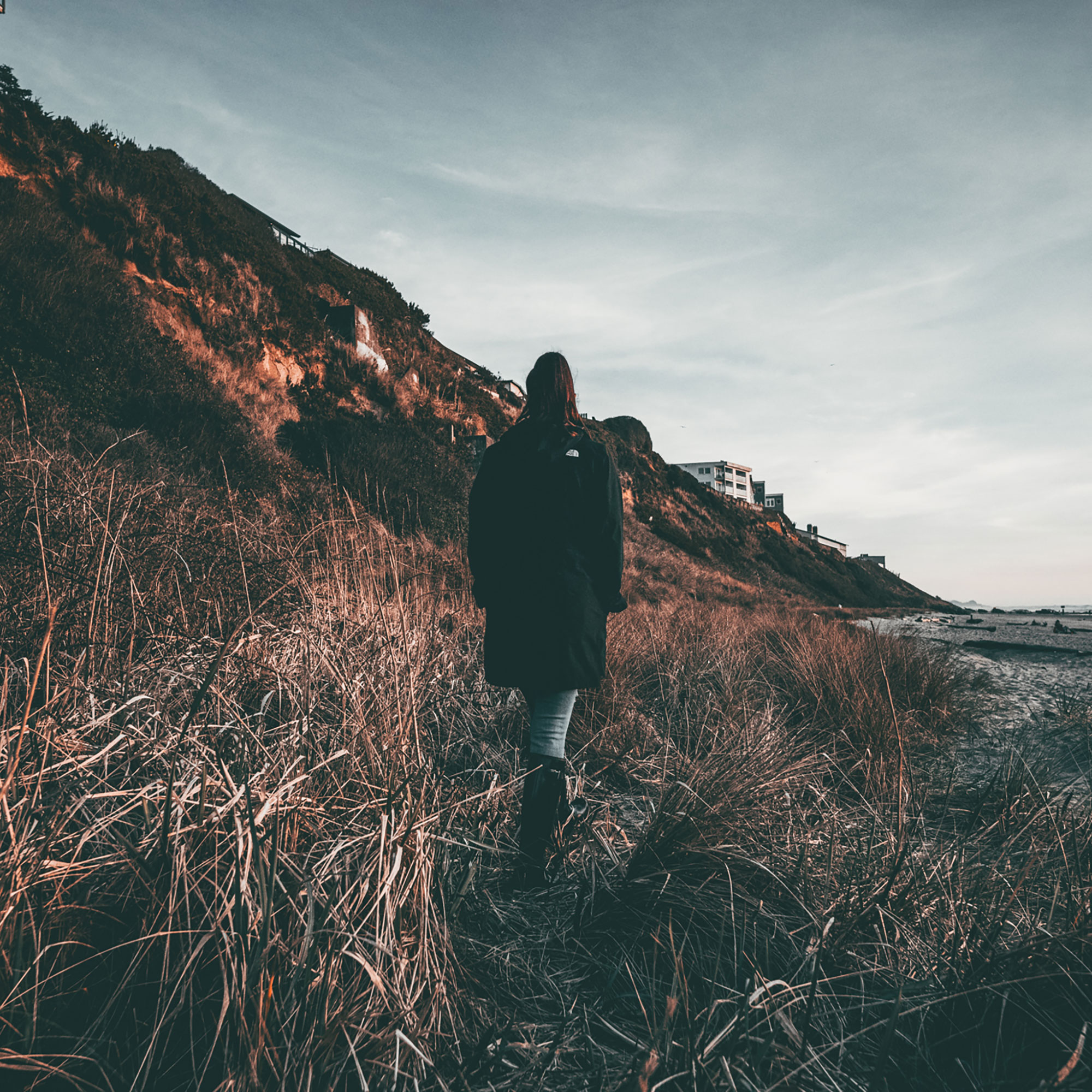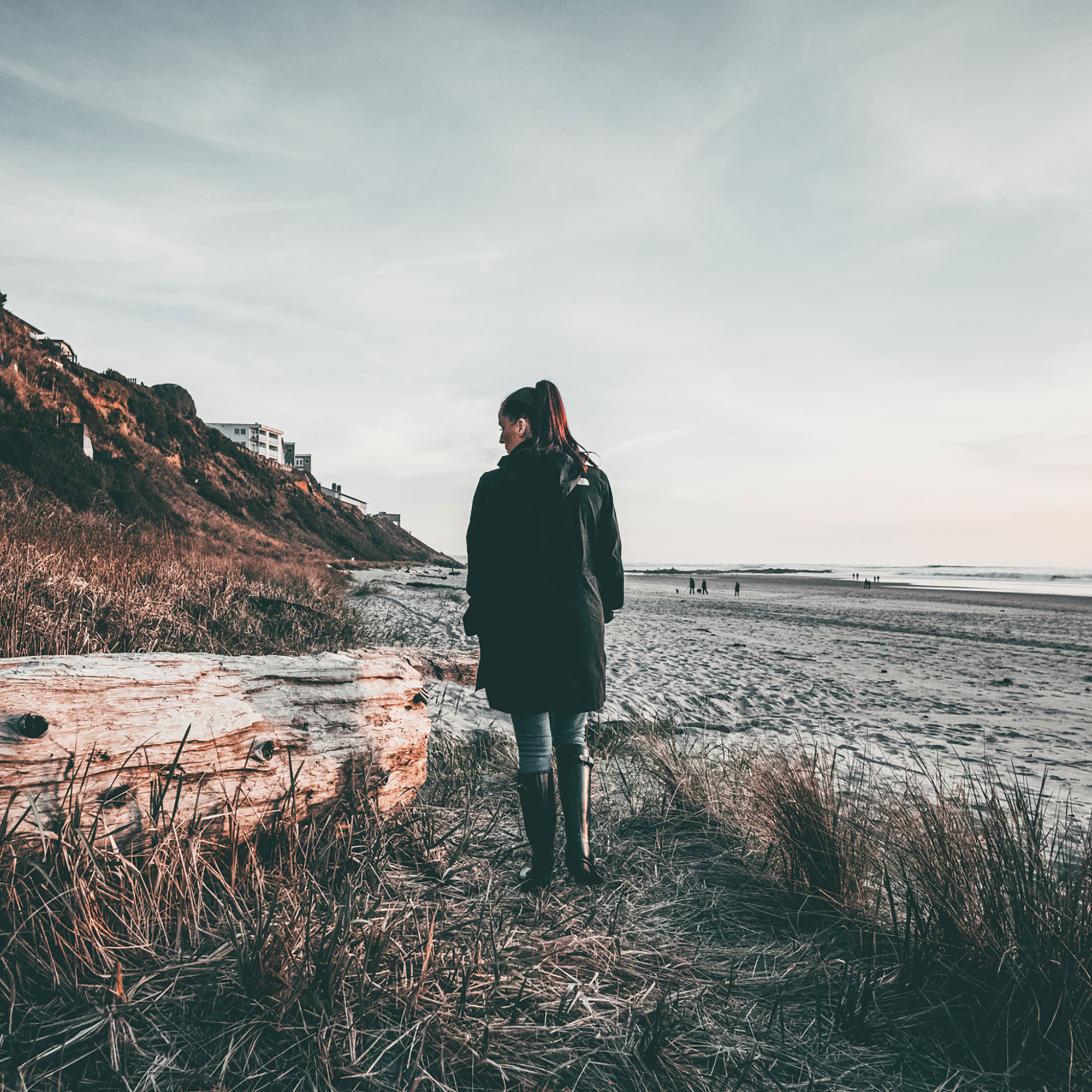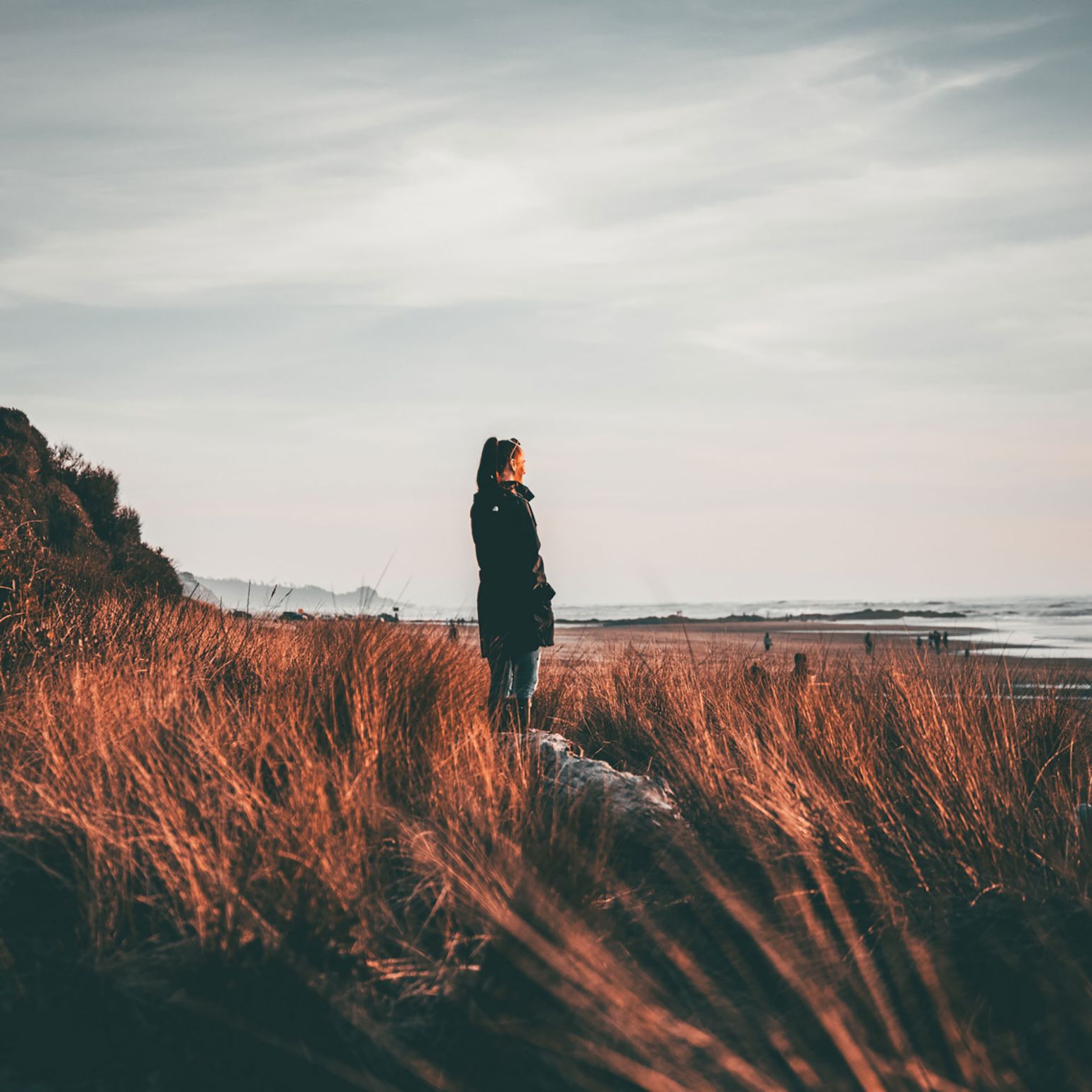 Cari walks peacefully through the tall beach grass, framed by sea breeze and sunshine—capturing the quiet beauty of the Oregon coast.